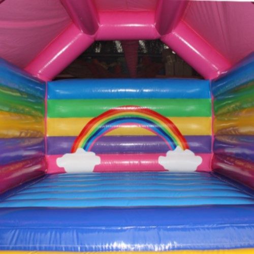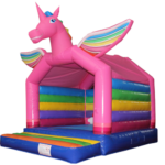 Zuckersüße Hüpfburg für alle kleinen Prinzessinnen, ein riesiges Pegasus-Einhorn lacht euch vom Dach der rosa Hüpfburg an.